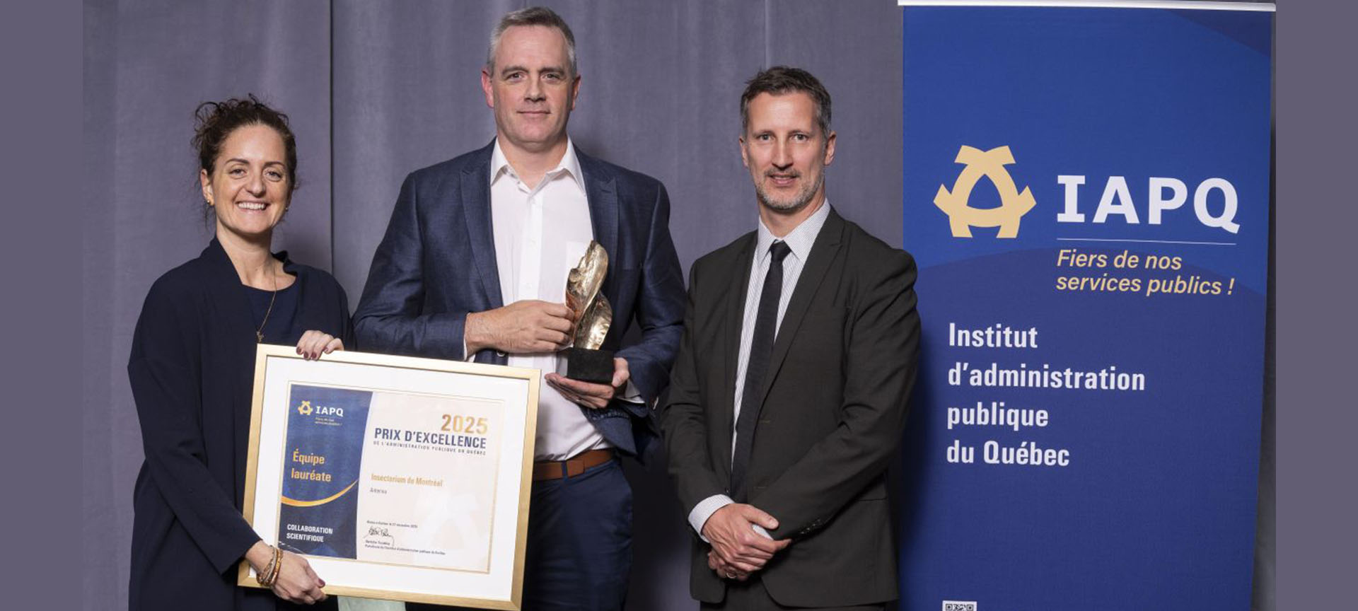Le scientifique en chef du Québec, Rémi Quirion, et le Fonds de recherche du Québec (FRQ) félicitent l’équipe lauréate et les deux équipes finalistes du Prix Collaboration scientifique, qui ont été récompensées le 27 novembre à Québec, lors de la cérémonie des Prix d’excellence de l’Institut d’administration publique du Québec (IAPQ).