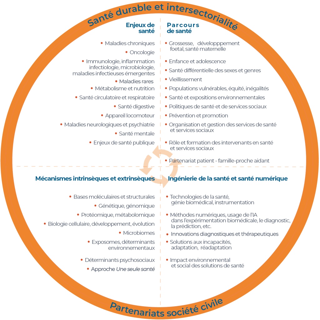 Chaque quadrant traite de la santé sous un angle plus spécifique : des mécanismes aux dérèglements de la santé, aux solutions de santé, en passant par les pressions systémiques exercées sur l’individu et la collectivité. Les quadrants sont poreux entre eux et s’interpellent, reflétant ainsi la nature transversale, évolutive et interconnectée des différents domaines de recherche en santé.